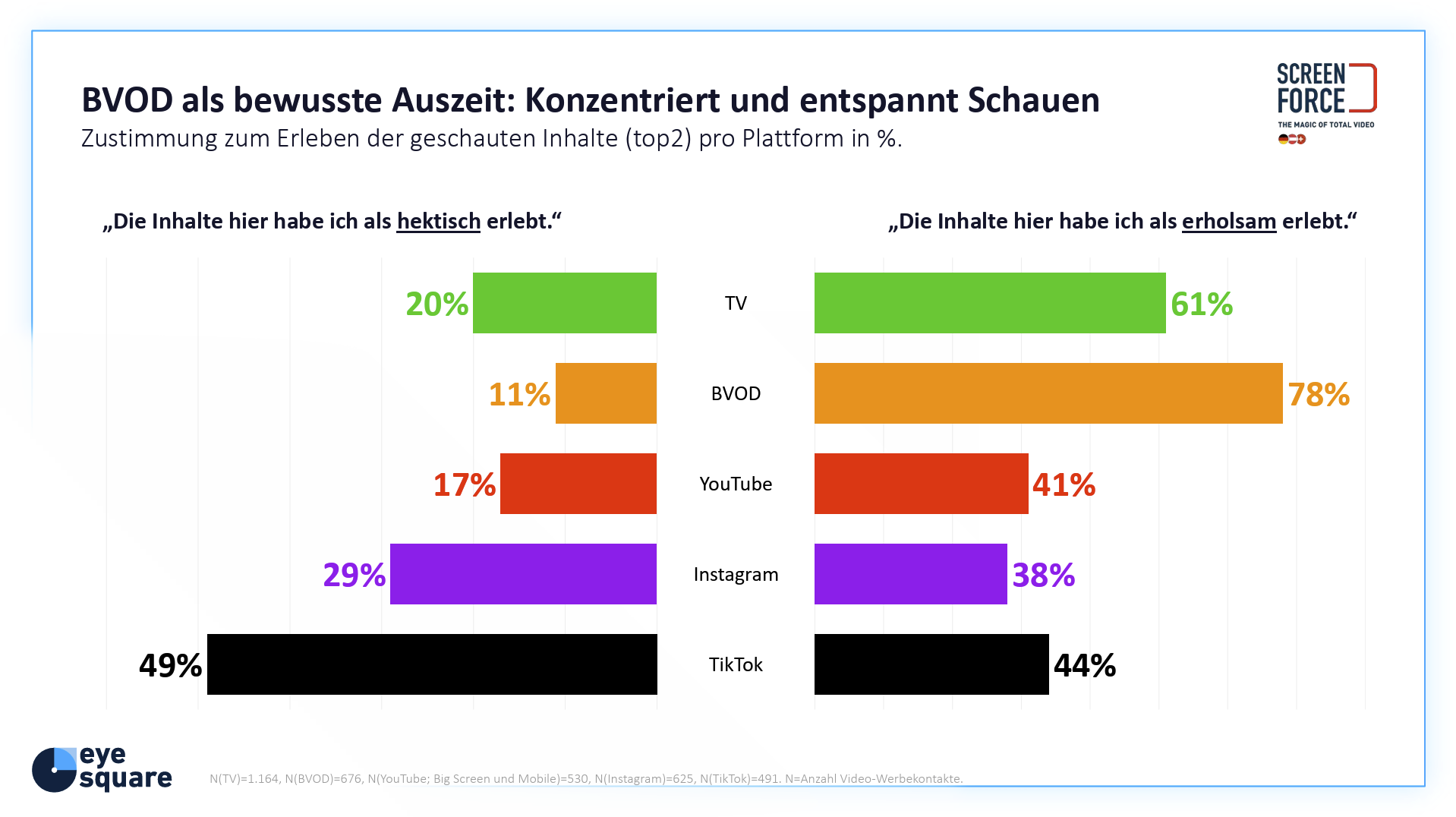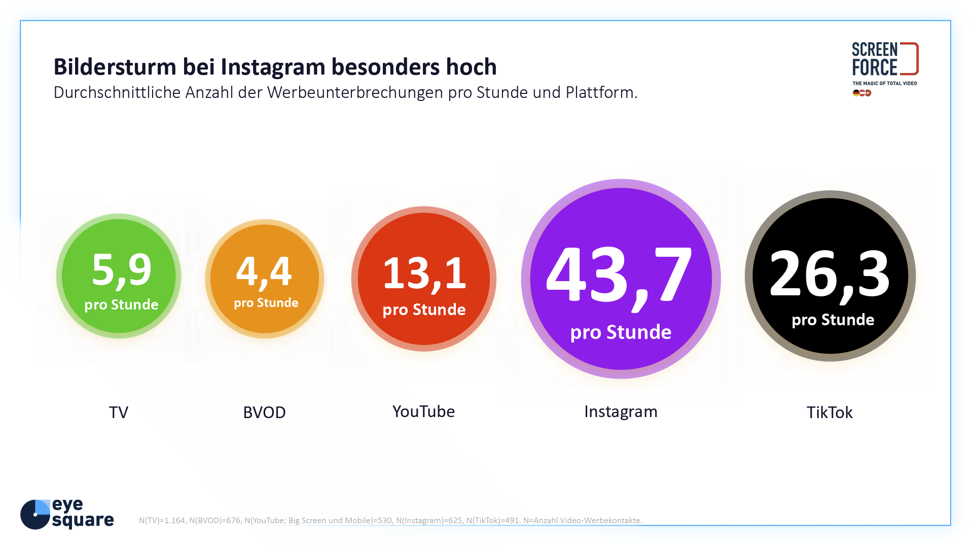 Laut der Studie gibt es keinen einzelnen Erfolgsfaktor für die Werbewirkung, jedoch wird diese durch die Nutzungsverfassung bestimmt. Die Studie liefert so klare Resultate wie nie zuvor. So zeigt sich etwa, dass der „Bildersturm“ auf Instagram mit 43,7 Werbeunterbrechungen pro Stunde besonders hoch ist. 49 Prozent der Befragten fühlen sich nach dem Konsum von kurzen Inhalten auf TikTok erschöpft. Der Ad Load im TV liegt mit 27 Ausspielungen pro Stunde im mittleren Bereich, während das TV-Umfeld einen positiven Einfluss auf das Markenimage hat. BVoD (20 Prozent) und TV (13 Prozent) weisen die höchste Werbeerinnerung auf, während sich Nutzer von Instagram (ein Prozent) und TikTok (drei Prozent) kaum an Werbung erinnern. Der Anteil konkreter Markennennungen ist bei keinem der untersuchten Kanäle höher als bei BVoD, wobei TV die höchste Detailerinnerung verzeichnet.