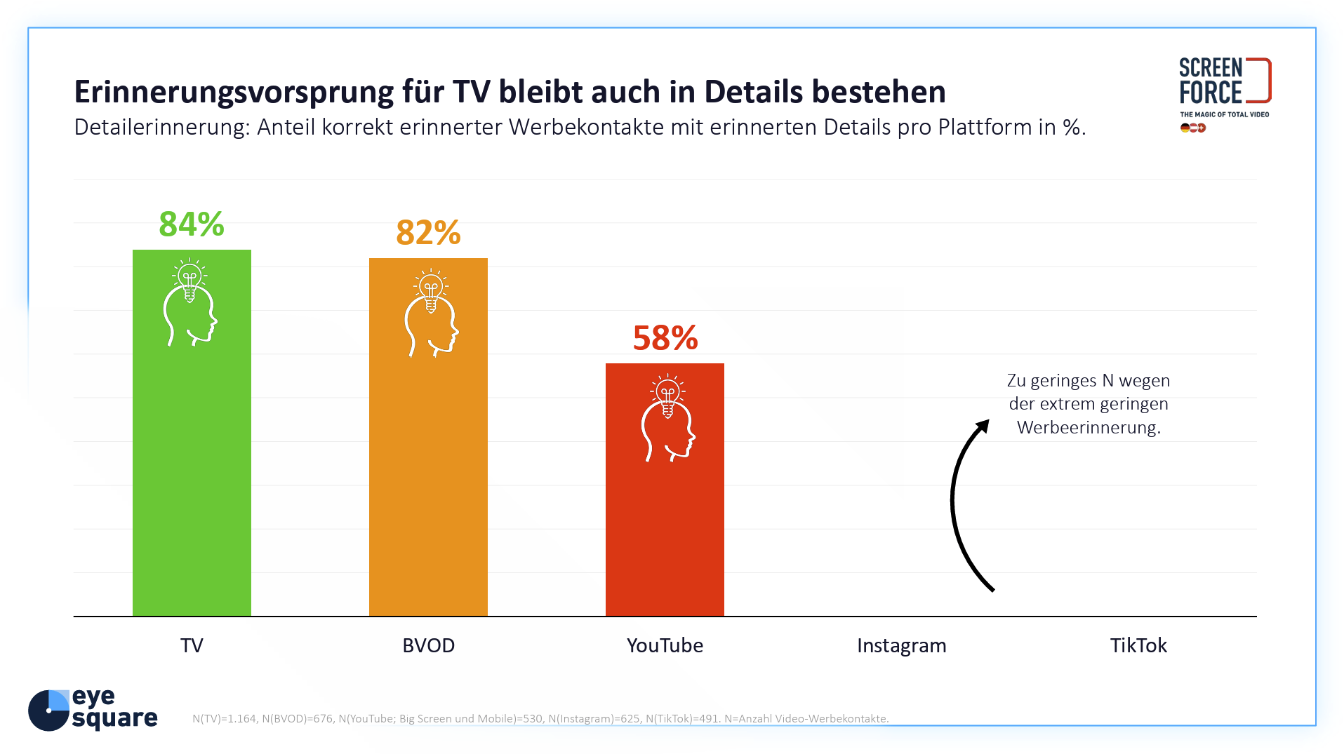 Eigentlich nicht, wie die Studie "Into the Wild" belegt: Während sich 2,7% der Probandinnen und Probanden der Studie frei an Werbemaßnahmen, und dabei wiederum 84% auch an Details aus TV-Spots erinnern konnten, waren die Werte für Instagram und TikTok so gering, dass sie keine signifikanten Messergebnisse liefern konnten.