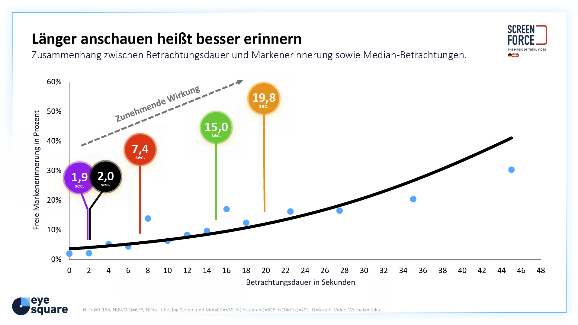 Um eine Botschaft - und somit auch eine Werbebotschaft - überhaupt aufnehmen zu können, bedarf es Zeit. Je länger, desto besser. Und während Werbung auf sozialen Medien in der Regel gerade mal 1-2 Sekunden und auf YouTube rund 7 Sekunden gesehen wird, sind es im klassischen Fernsehen 15 Sekunden, und in Mediatheken sogar fast 20 Sekunden.
