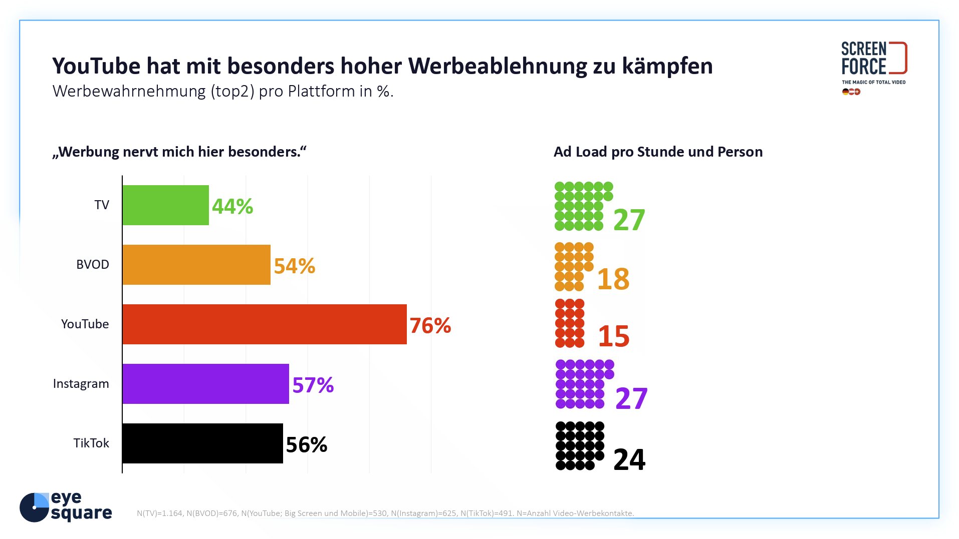 Die Studie, die vom renommierten Forschungsinstitut eye square für den gesamten DACH-Raum konzipiert wurde, beleuchtet Total Video (TV & BVoD), YouTube (auf dem Big Screen & Smartphone) sowie Social Media (Instagram & TikTok). Die zentralen Fragestellungen der Studie sind: Wie steht es um Kontaktqualität und Werbewirkung unter realistischen Bedingungen? Wie wird Werbung wahrgenommen, wie aufmerksam wird sie betrachtet und wie häufig wird sie vermieden?