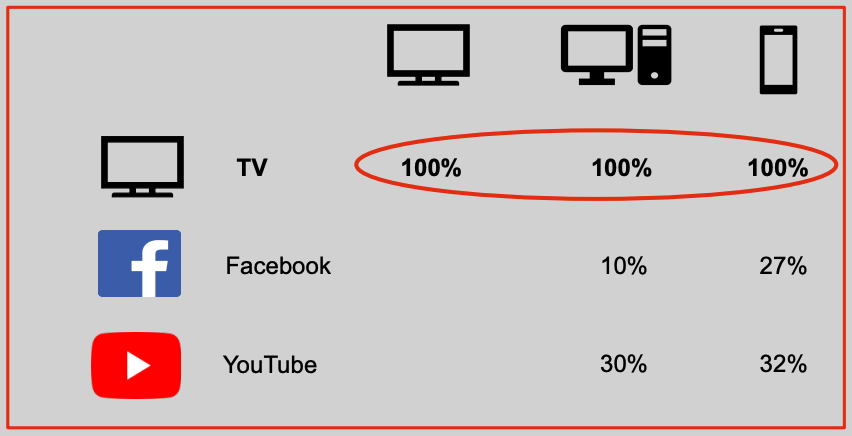 Mit ein Grund dafür ist die sogenannte "Coverage". Das bedeutet, wieviel Prozent der Bildschirmfläche wird für Werbung verwendet. Bei TV: 100%.