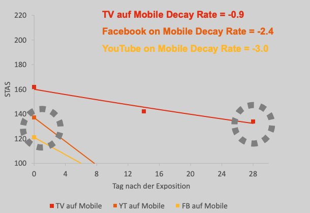 Karen Nelson-Field spricht hier von der "Decay Rate, also dem Ausmaß des Wirkungsverlustes. Das heißt: Unmittelbar nach dem Werbekontakt ist die Abverkaufswirkung, also die Wahrscheinlichkeit, dass dem Werbekontakt ein Kaufakt folgt, am größten. Diese Wirkung nimmt - bei allen Medien - im Laufe der Zeit aber ab. Doch die Wirkung von Werbung auf Facebook sinkt 2,5-mal und die von YouTube 3x-mal schneller als jene des Fernsehens. Oder anders gesagt: Der STAS-Index von Fernsehen ist selbst 28 Tage (!) nach dem Werbekontakt noch immer höher als der von Facebook und YouTube unmittelbar nac der Exposition.