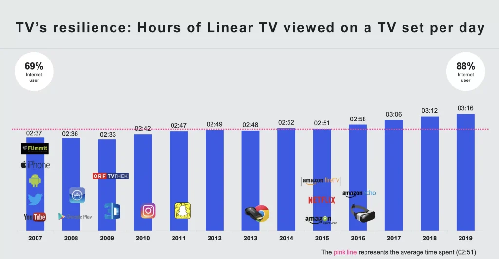 Laut RTR AGTT Studie (Medienbehörde / Teletest) nutzen wöchentlich alle Österreicherinnen und Österreicher – je nach Altersgruppe sind es entweder 99 % oder 100 % – Bewegtbildinhalte in irgendeiner Form. Dominant dabei bleibt hier ganz klar die lineare Nutzung von TV: mit 77% stellt sie noch immer den Löwenanteil, man erkennt jedoch auch einen Trend zu zeitunabhängigen Nutzungsformen. Non-lineare Nutzungsformen werden somit immer wichtiger, das lineare Fernsehen dominiert aber nach wie vor ganz klar – wider dem Erwarten der Branche. Laut Studien wird die Zeit, die die Menschen in Großbritannien vor dem Fernseher verbringen, um 20% weniger eingeschätzt als sie tatsächlich beträgt.