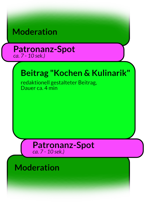• 2 Einbindungen des Patronanz-Spots pro Beitrag (am Anfang und am Ende) - 24 Ausstrahlungen pro Woche insgesamt