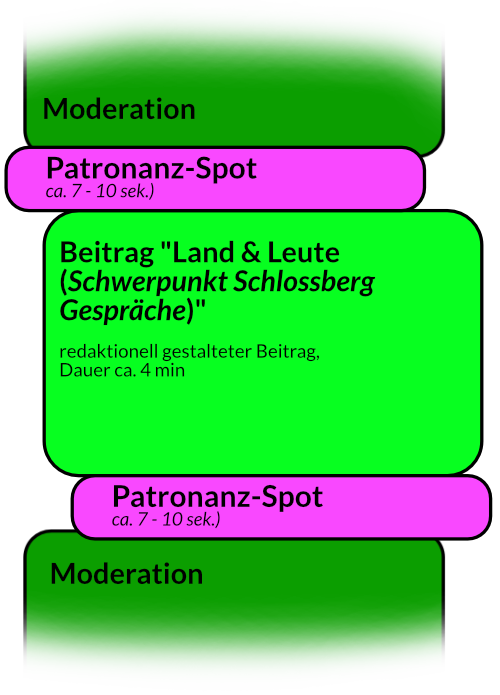 • 2 Einbindungen des Patronanz-Spots pro Beitrag (am Anfang und am Ende) - 24 Ausstrahlungen pro Woche insgesamt