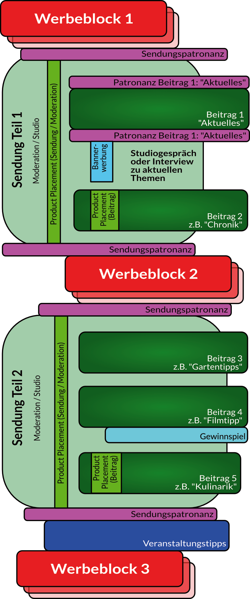 Für jeden Beitrag kann eine Co-Produktion ("Produktionskostenzuschuss"), ein Product Placement oder eine Beitrags-/Rubrikenpatronanz gebucht werden.