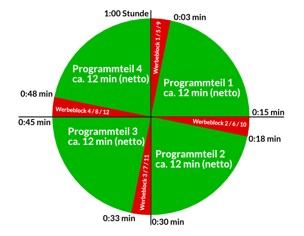 Das Programm ist im 2-Stunden-Rhythmus gestaltet. Der seitlich dargestellte 2-Stunden-Programmblock wiederholt sich (einschließlich Werbung) 10 Mal pro Tag. Weitere Informationen dazu finden Sie im Abschnitt Programmschema.