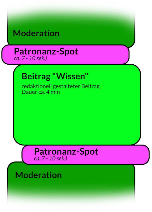 • 2 Einbindungen des Patronanz-Spots pro Beitrag (am Anfang und am Ende) - 24 Ausstrahlungen pro Woche insgesamt